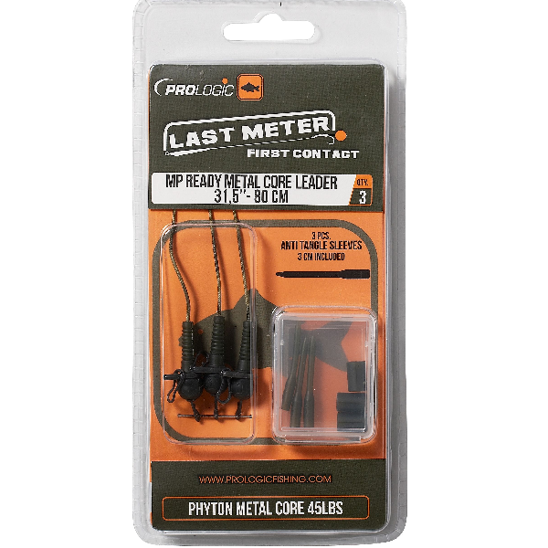 Leader z 80 cm 45 lb materiału z metalowym rdzeniem, półsztywny amortyzator z pierścieniem, klips Multi, krętlik Quick Change i 3 cm tulejka antysplątaniowa.