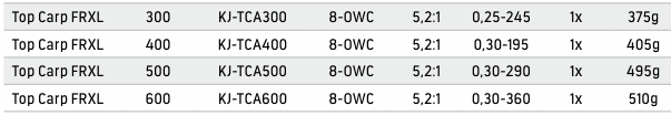 Bogata seria kołowrotków z wolnym bie giem, obejmująca podstawową wersję FRT i wzbogaconą, luksusową FRXL. Wersja FRT ma solidny 3-łożyskowy mechanizm z łożyskiem opo rowym OWC, szpulkę główną i zapasową z tworzywa. Wersja FRXL to dodatkowo wzmocniona konstrukcja z 8 łożyskami – w tym łożyskiem oporowym OWC, szpulką główną z duraluminium i zapasową szpulką z tworzywa.