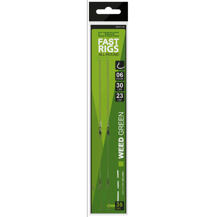 Ten podstawowy zestaw z włosem jest prawdopodobnie najczęściej używanym wzorem w łowieniu karpi. Super ostry haczyk z zadziorami jest związany na plecionce. Każdy zestaw jest wykończony krętlikiem w rozmiarze 8, który idealnie pasuje do klipsów zabezpieczających CTEC w rozmiarze 8. Podobnie jak w przypadku całej gamy sprzętu końcowego CTEC, te Fast Rigi są dostępne w kolorze błotnistym brązowym lub zielonozielonym.