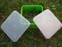 Prostokątne pudełko wykonane z wysokiej jakości trwałego i elastycznego plastiku. Wyposażone w dwie przykrywki. Jedna z otworami, druga bez otworów.