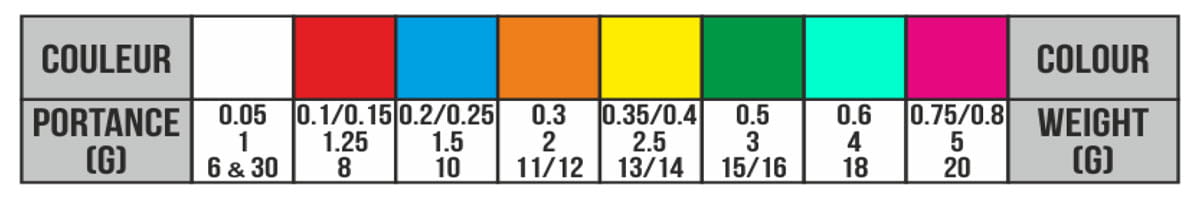 W tej serii dostępnych jest 8 ciężarków: 0,30 – 0,40 – 0,60 – 0,80 – 1,00 – 1,25 – 1,50 i 2,00 gr.