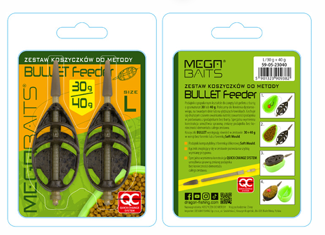 Podajnik o popularnym kształcie do zanęty lub pelletu z burtą o gra maturze 30 lub 40 g. Polecamy do łowienia dystansowego, na twar dym dnie lub na głębszych łowiskach. Cechuje się dłuższym czasem uwalniania nabitej zawartości podajnika w porównaniu z podajni kami bez burty. Specjalna wymienna konstrukcja umożliwia spraw ną zmianę podajnika bez konieczności demontażu całego zestawu. Koszyczki BULLET występują również w zestawie: 30+40 g w wer sji bez foremki lub z foremką Soft Mould. ■ Podajnik kompatybilny z foremką silikonową Soft Mould. ■ Łącznik znajdujący się w zestawie pozwala na szybką wymianę przyponu. ■ Specjalna wymienna konstrukcja QUICK CHANGE SYSTEM umożliwia sprawną zmianę podajnika bez konieczności demontażu całego zestawu.
